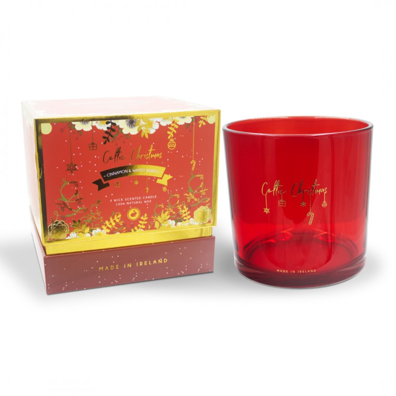 This sweet and spicy cinnamon and winter berries 4 wick candle is made in Ireland from 100% plant wax using a blend of soy, palm and rapeseed oil with no petrol-chemicals or sulphates. This fragrant candle burns cleanly for approximately, 65hours; Set in a beautiful, recycled glass container and packaged in a rigid box which is recycled and recyclable.