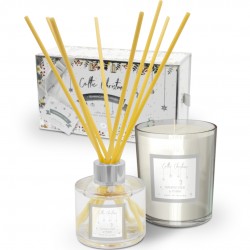 The set includes one 200g aromapot tumbler candle poured from 100% plant wax from a blend of soy, palm and rapeseed oil with no petrol-chemicals or sulphates and a 100g diffuser made with the finest natural essential oils. The candle has a clean burn with no waste and a burn time of up to 45 hours; the diffuser oil release time is up to 4 months. Reeds are included.